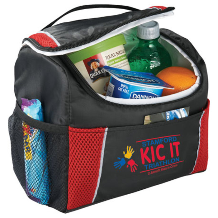 sku: 2180-05Inspired by sport duffels, this lunch cooler has unique air-mesh accents and trim. Open main compartment with large U-shaped zippered flap closure. Front pocket with Velcro closure and clear rear ID window. Side mesh pocket. Top carry handle. Insulated PEVA lining.